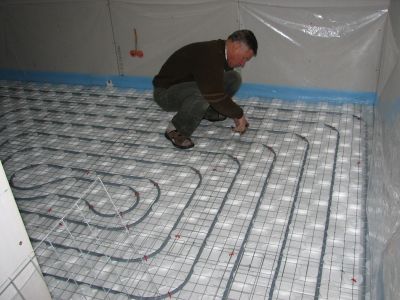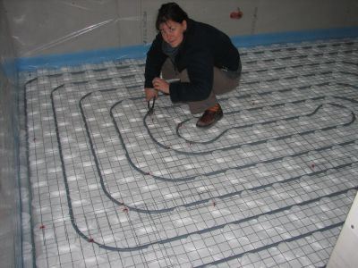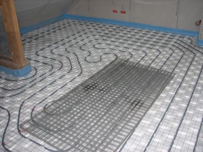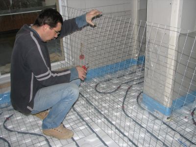 Pour le béton spécial que nous voulons couler, il faut poser sur les tuyaux de chauffage un treillis soudé galvanisé qui servira de conducteur de chaleur à travers le béton.