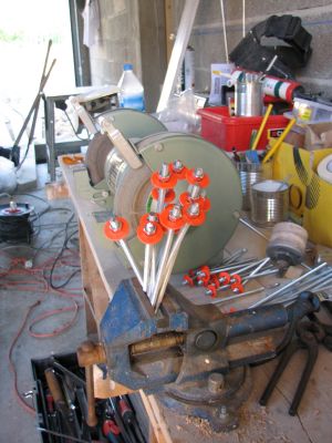 Pour déterminer le niveau de béton avec exactitude, Laurent et moi avons déjà fait un trait de niveau sur tout les murs de la maison et pour le milieu de pièces j’ai fabriqué des piges. C’est de la tige filtée avec un écrou plus une rondelle peinte et un écrou par dessus. On plante la tige filtée dans le polystirène et grace à une règle ou un lazer on place la rondelle à niveau. Le but est que le béton arrive juste au dessous de la rondelle. Malin ! C’est très joli en bouquet aussi, et quand on pense q’on peut varier les couleurs, je n’vous dit pas.