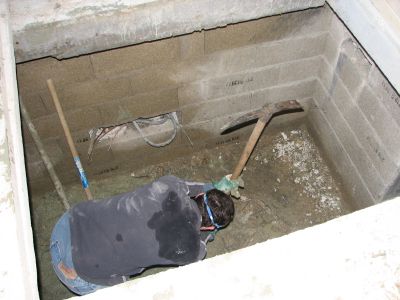 Et puis le dimanche après-midi, comme on a eu peur de s’ennuyer, Laurent s’est dit qu’on allait creuser la terre sous le garage au niveau de la fosse pour y couler une chape, histoire d’avoir les pieds au sec et au propre quand il fera de la mécanique. Alors on a creuser sur 3.5 X 2 métres sur 10cm d’épaisseur. ça fait du bien de revenir à la terre.